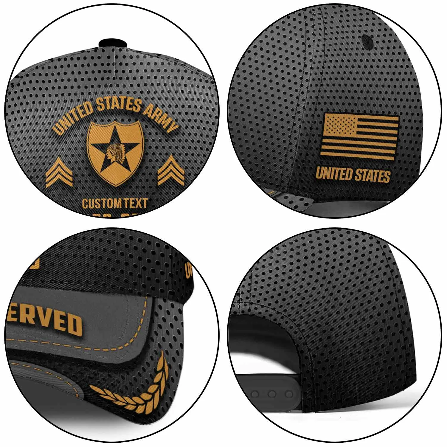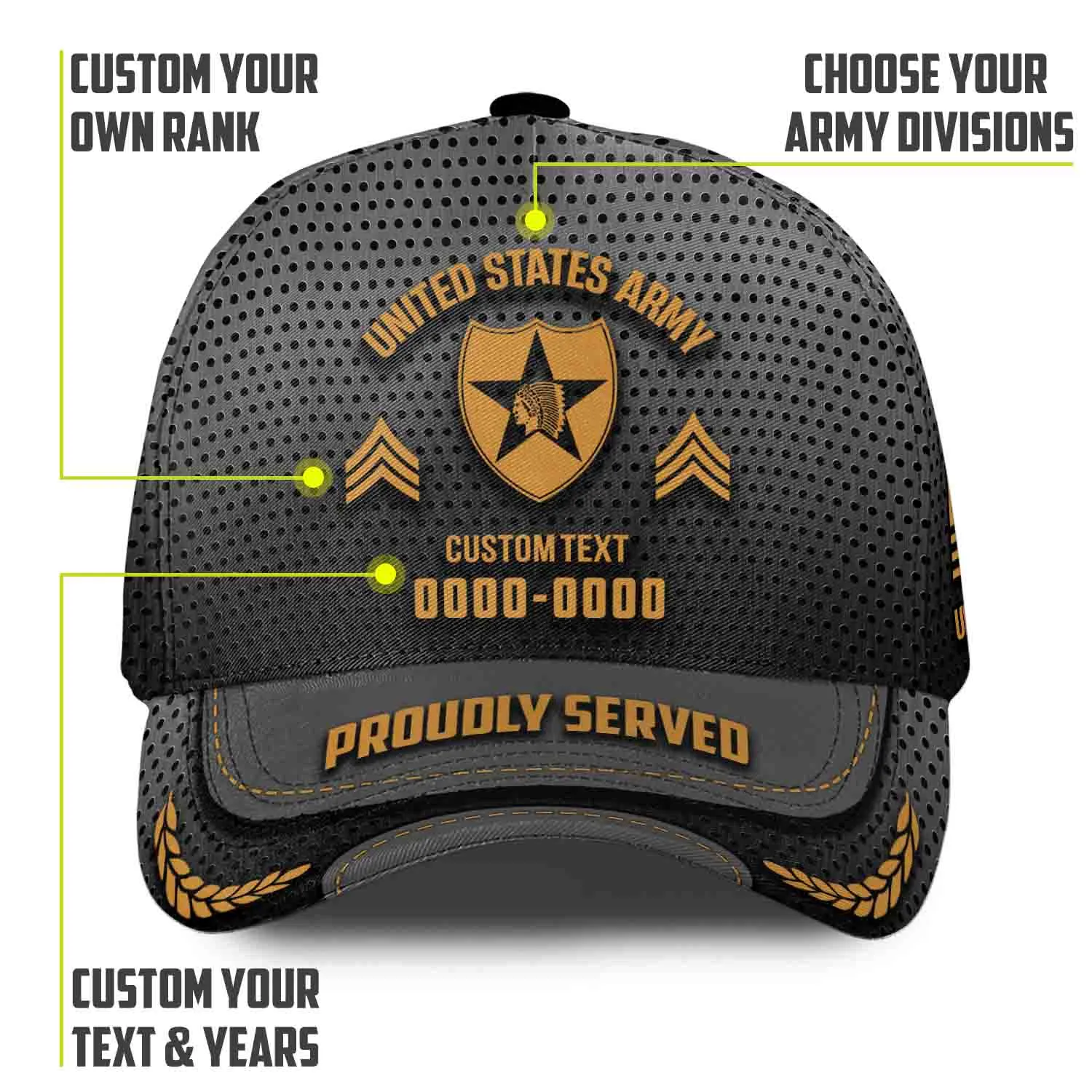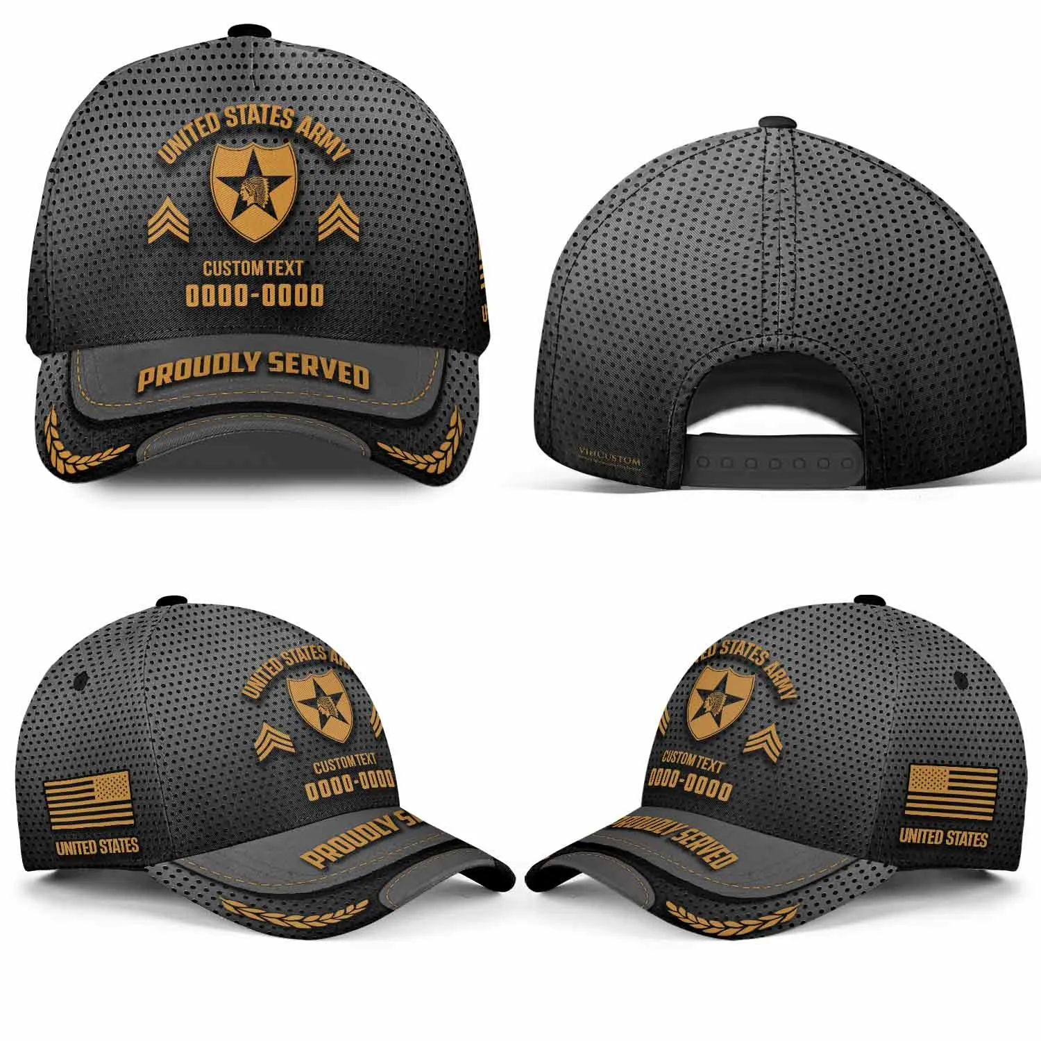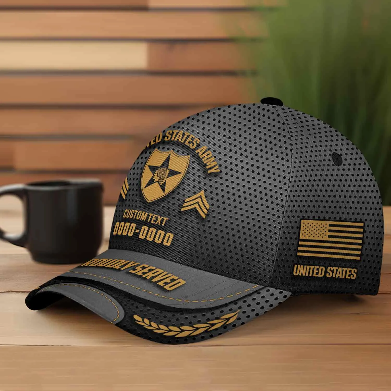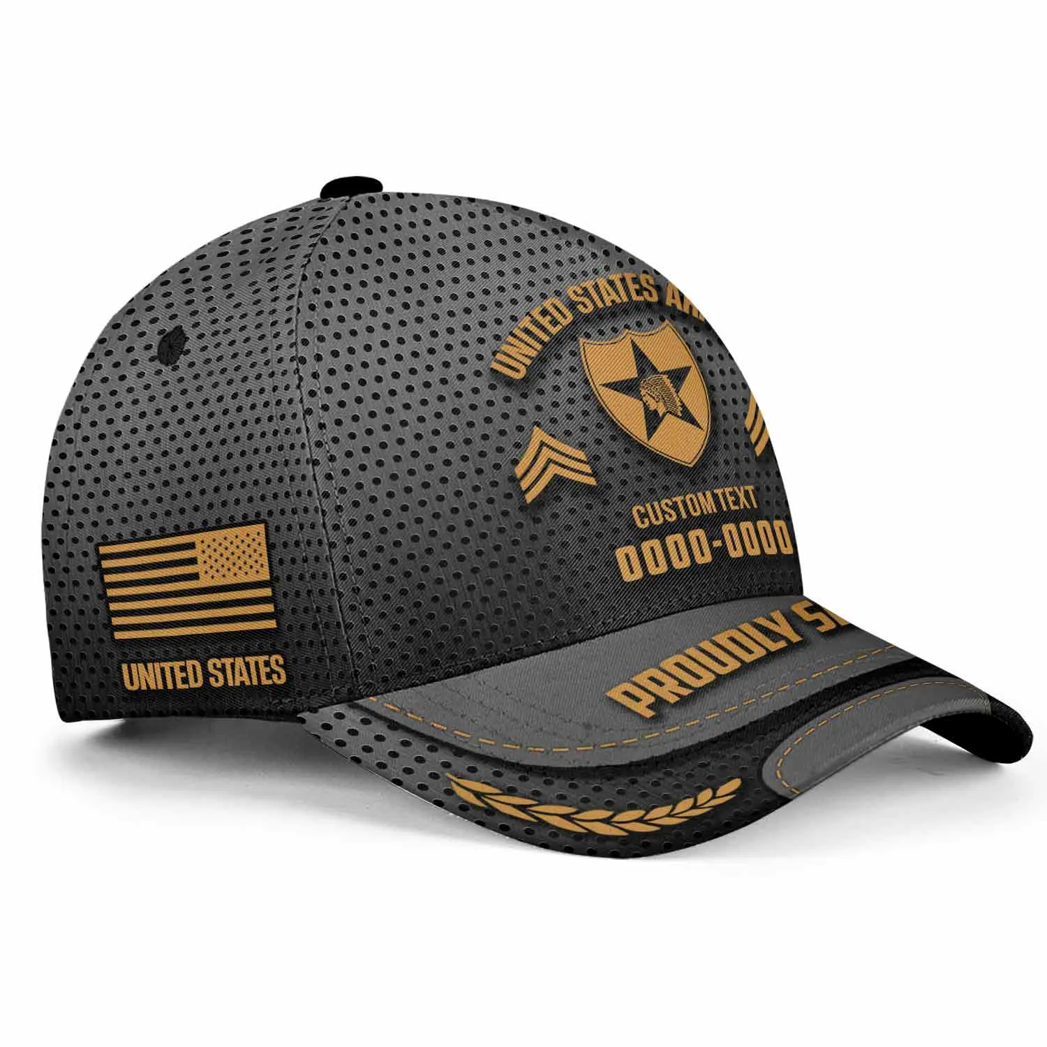 The “Proudly Served” Visor: The brim is constructed with a simulated leather edge, featuring the words “PROUDLY SERVED” and distinguished golden laurel wreaths to signify honorable service.