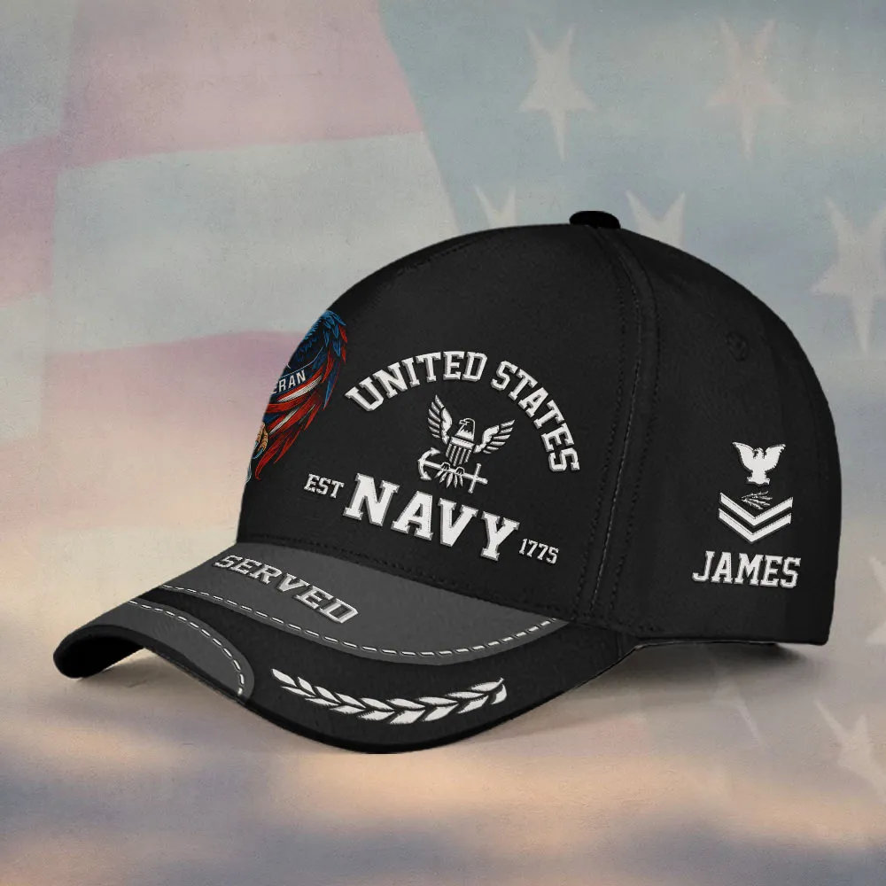 The Commander’s Visor: The sleek grey brim declares your status with the bold, embossed statement: “PROUDLY SERVED”, framed by classic officer laurel wreaths.