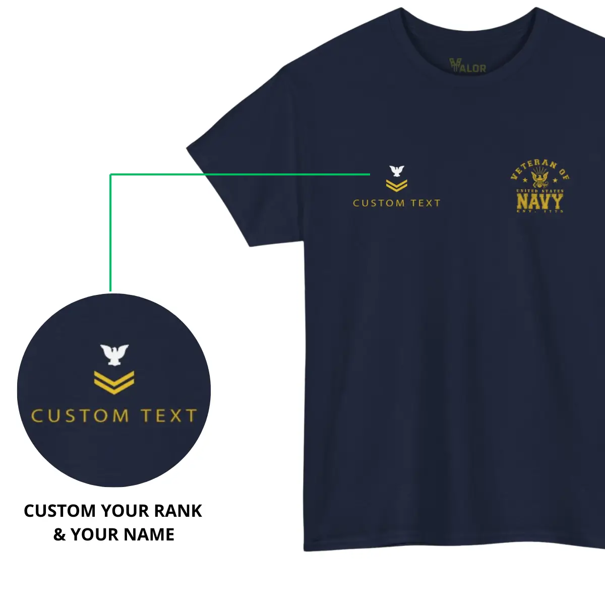 This design embodies what every U.S. Navy Veteran understands at their core — the ocean isn’t just a place we serve. It’s territory we protect, dominate, and call our own. The front of this shirt features your custom name and rank, paired with the Navy emblem, creating a personal tribute to your service.