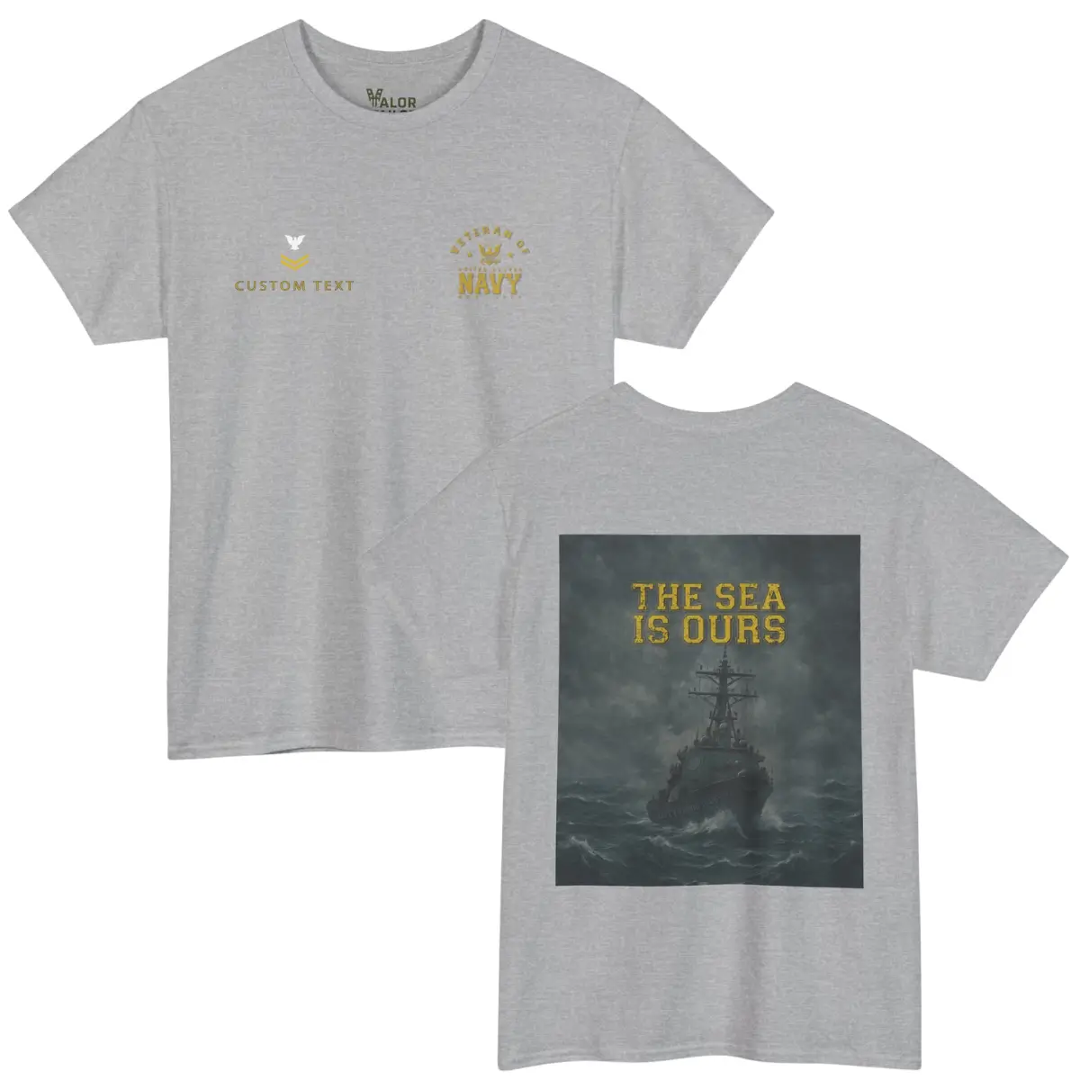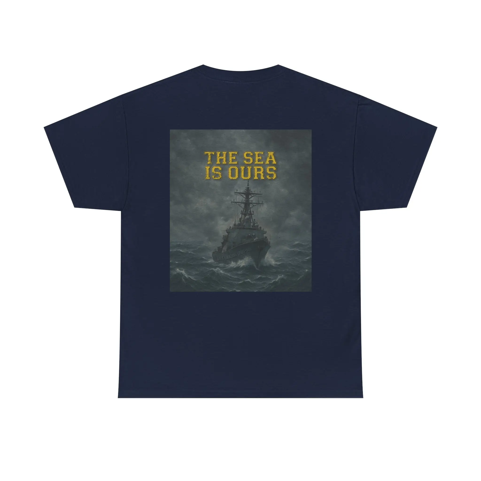On the back, the powerful statement “THE SEA IS OURS” rises above a warship cutting through rough waters — a visual reminder of strength, vigilance, and the unmatched pride of those who stood the watch.