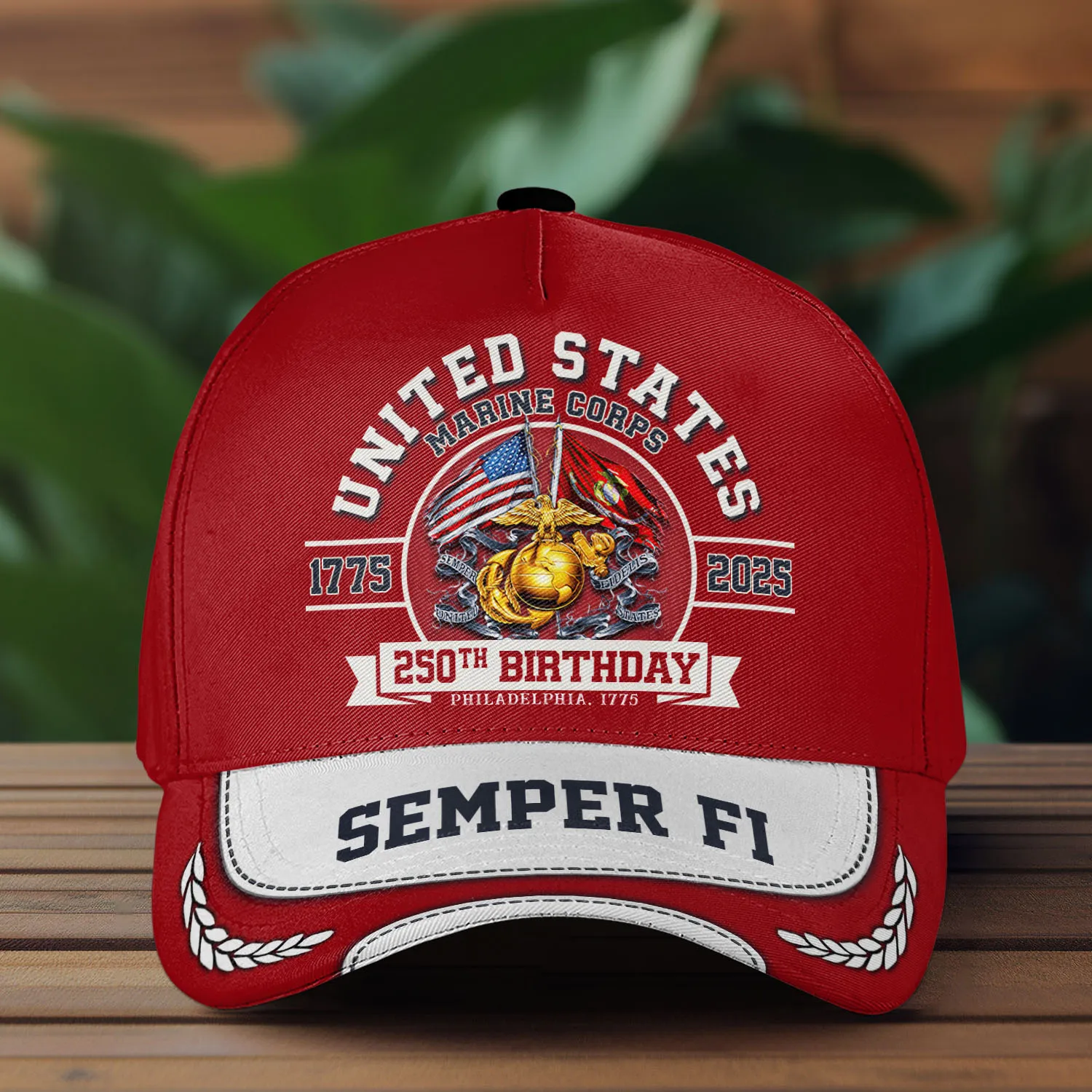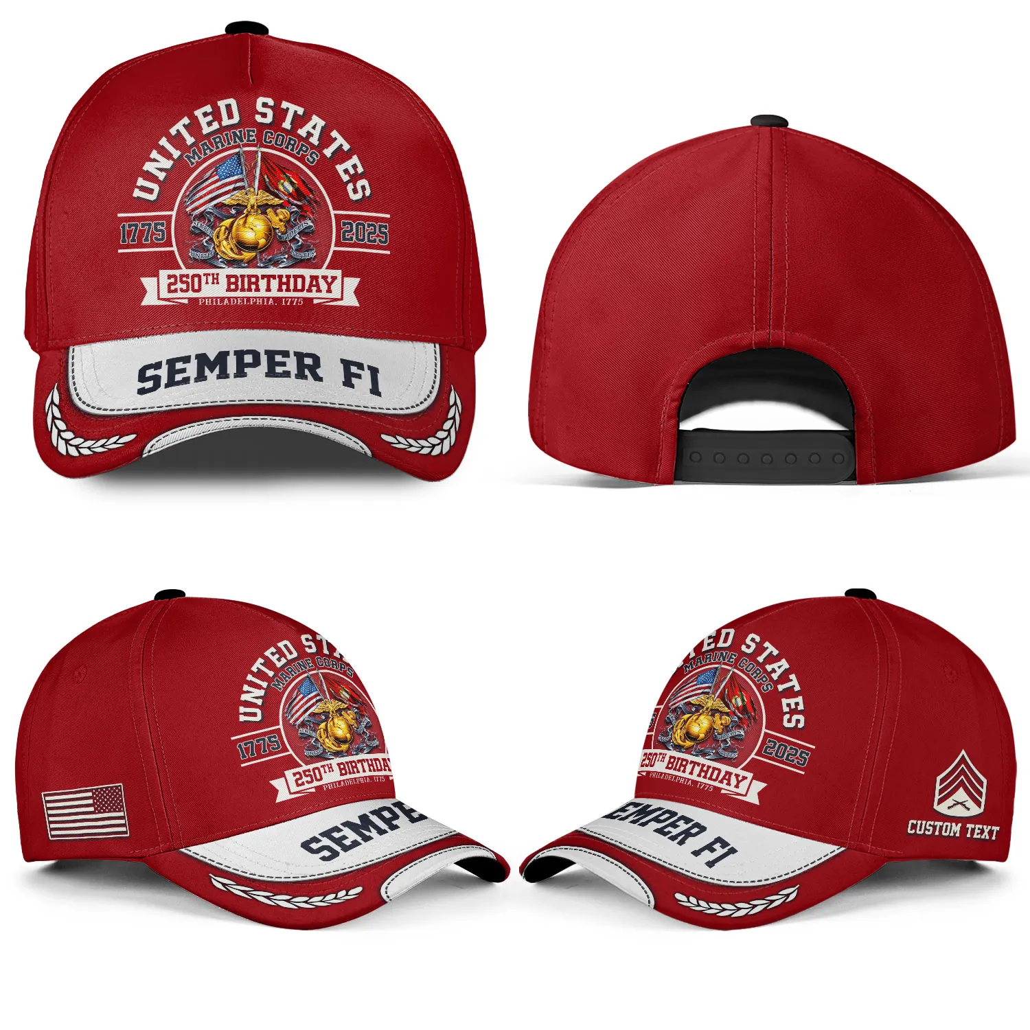Celebrate a quarter-millennium of brotherhood with the Custom USMC 250th Birthday Hat (1775-2025). Featuring a striking red and white commemorative design, crossed flags, and a Semper Fi visor. Personalize the side panel with your exact Rank and Name. Order your piece of history today!