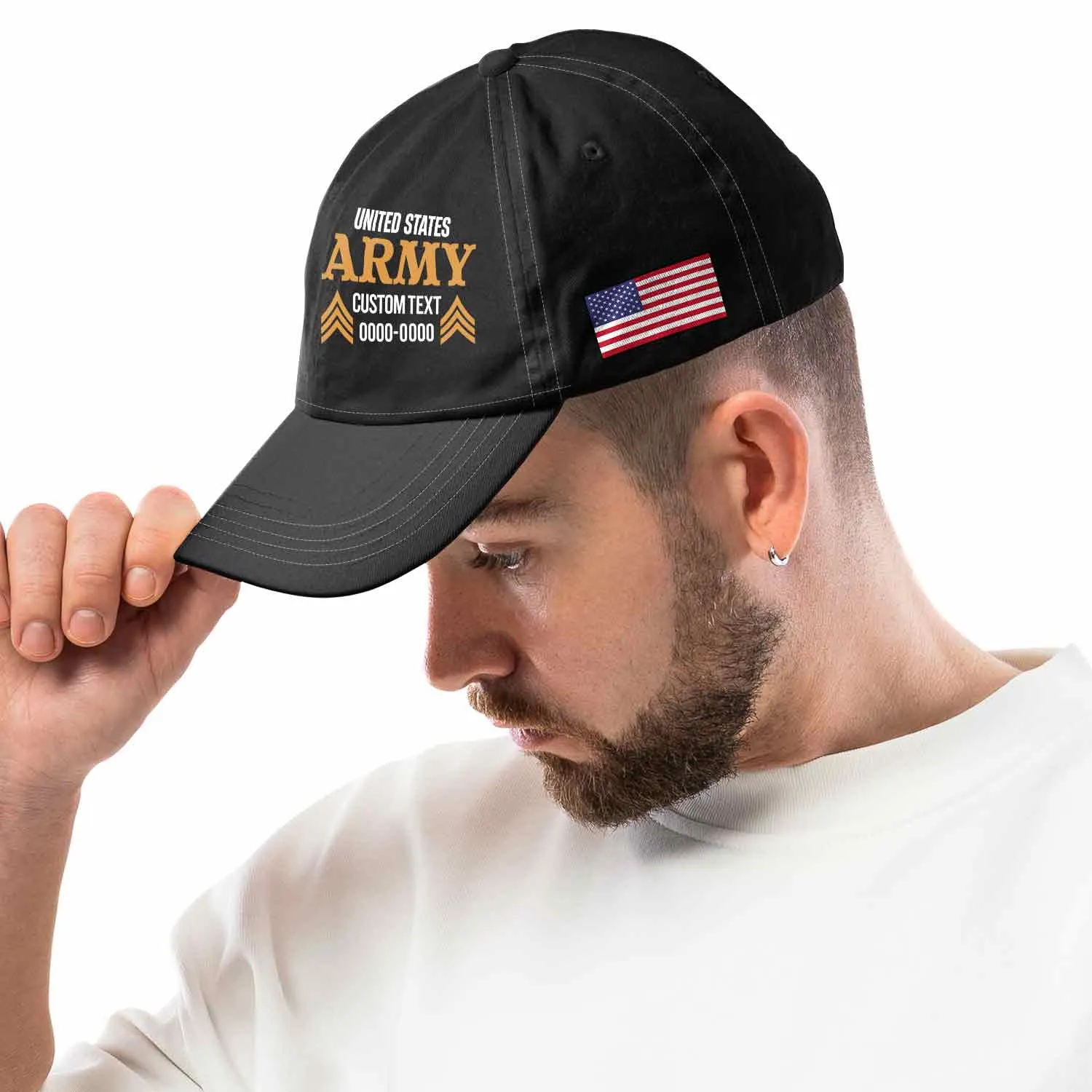 Stand out with the sharp, modern design of our Custom Split-Layout Veteran Hat. Featuring a bold typographic style. Personalize your Military Branch, Rank, Name, and Service Years. Clean, rugged, and proudly Made in the USA. Order yours today!