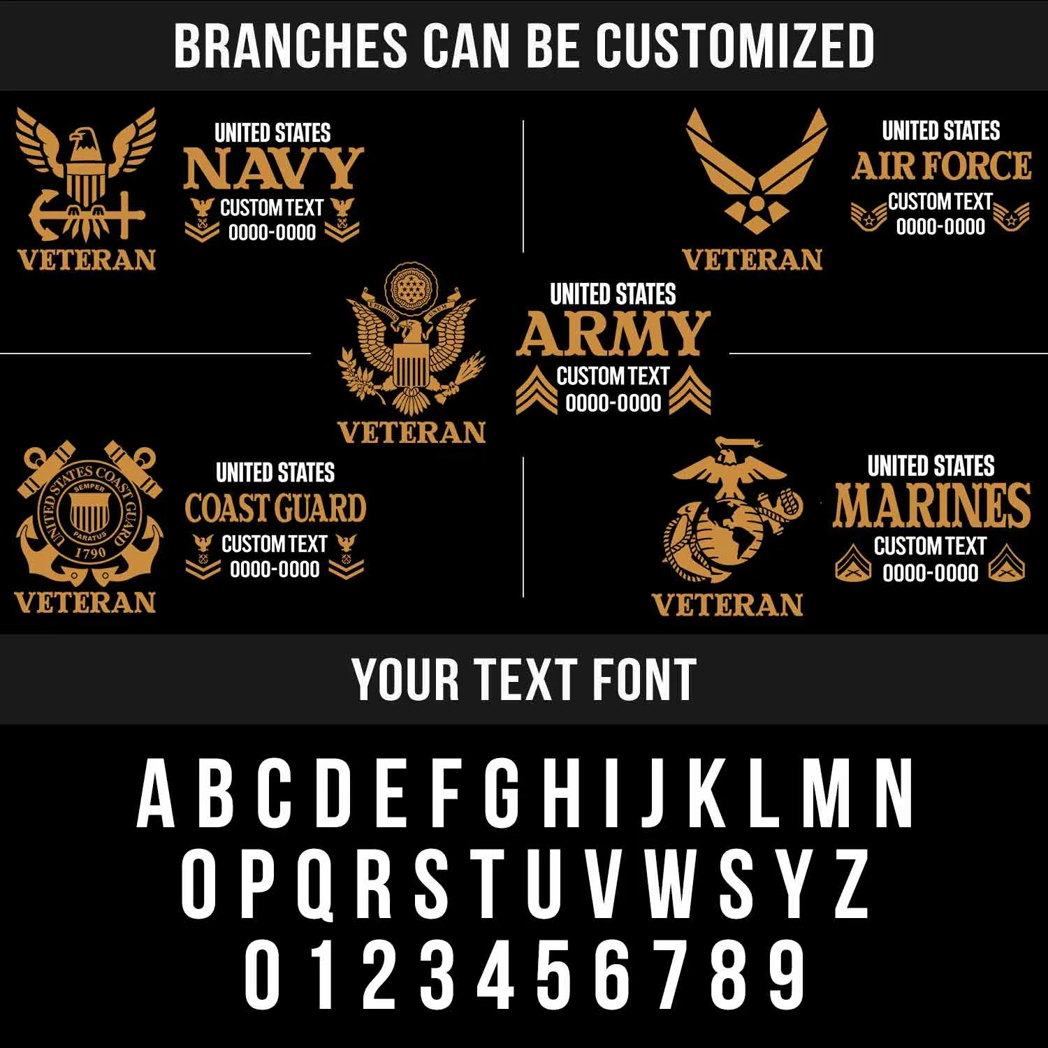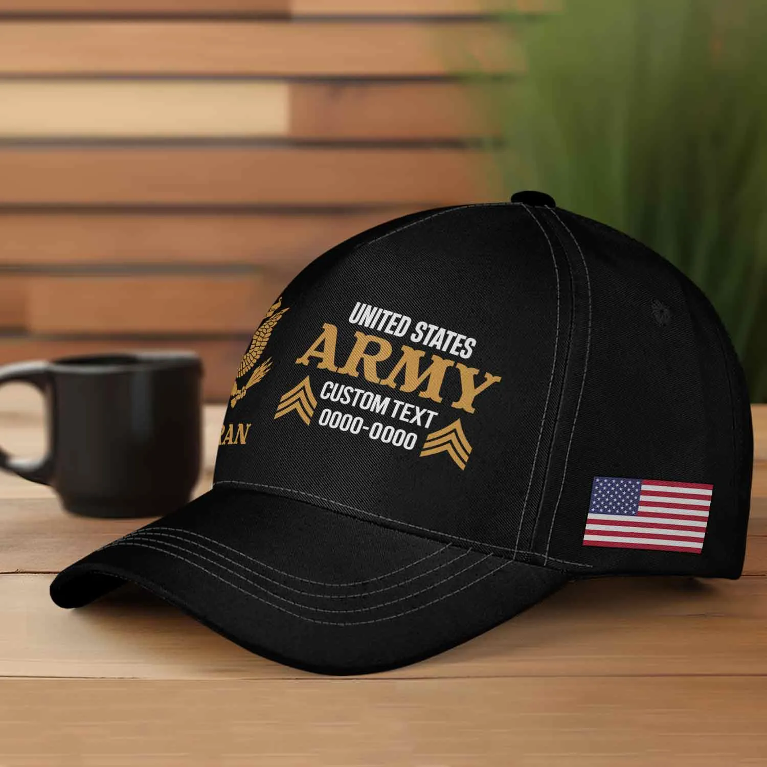 • The Asymmetric Layout: We reimagined the standard veteran cap by splitting the profile. The left side proudly anchors your Official Branch Seal and “VETERAN” status, while the right side delivers your specific service details in bold, high-contrast typography.
