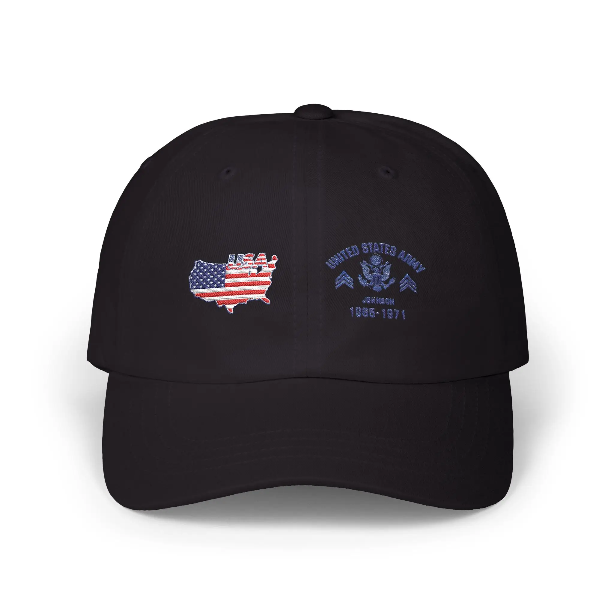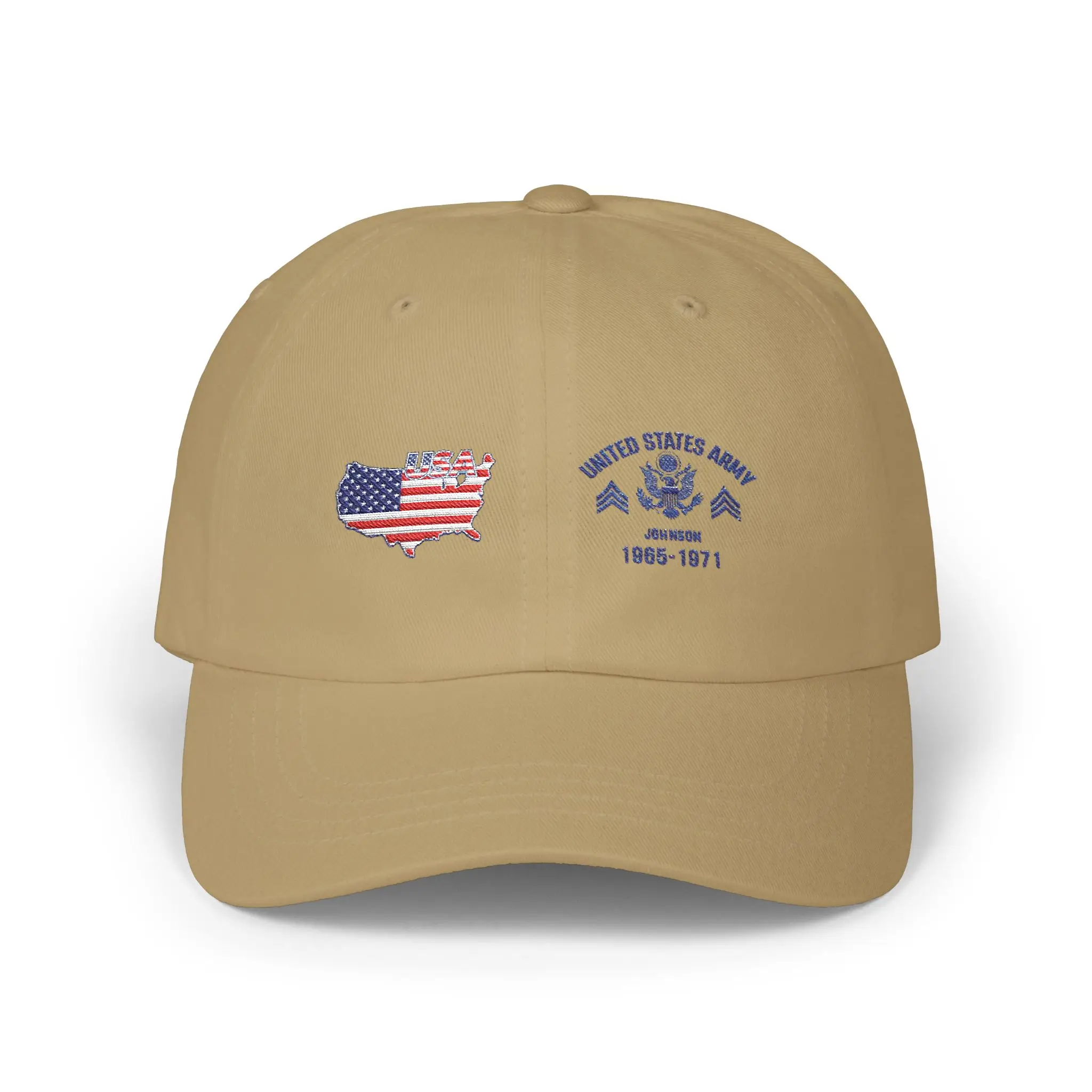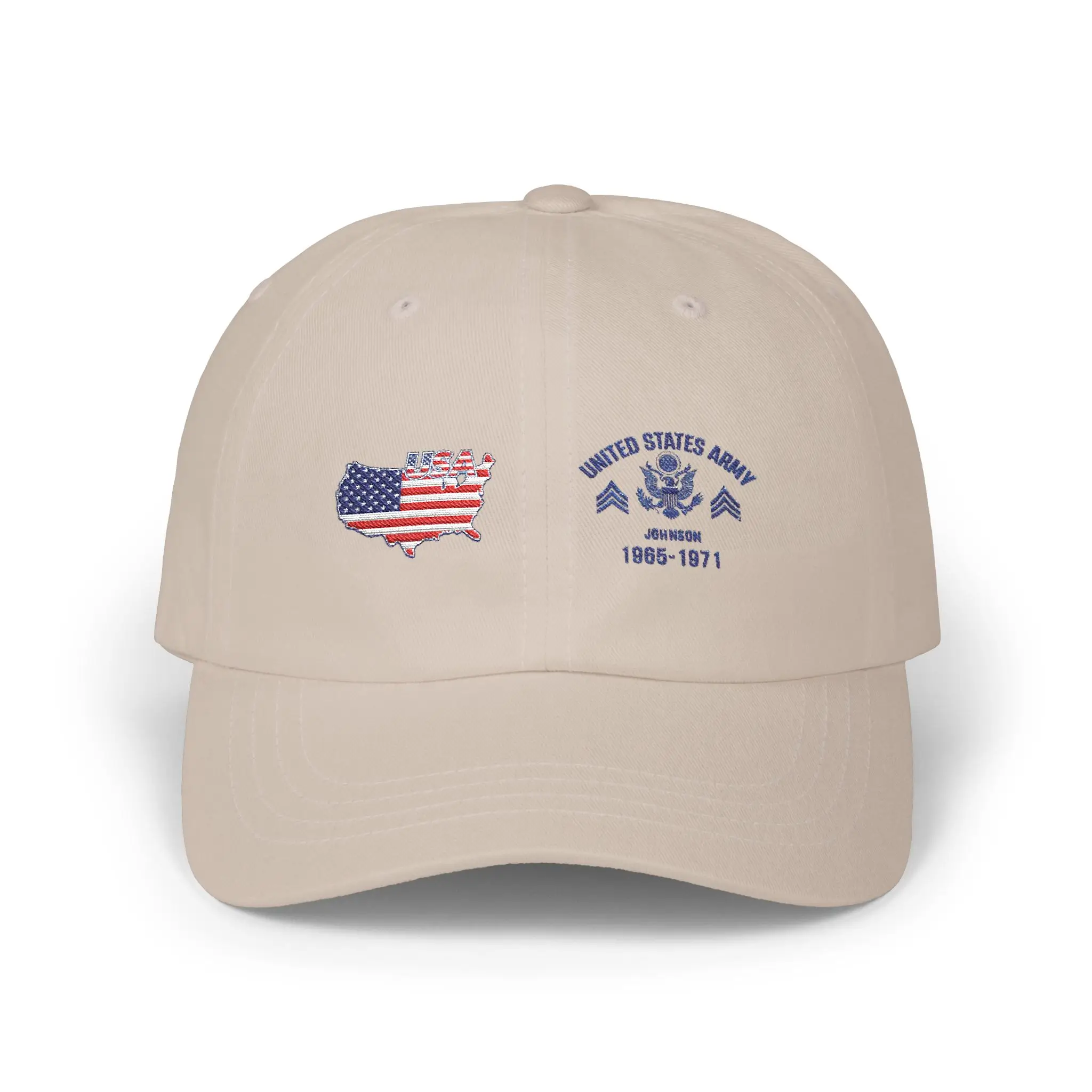The front features the proud U.S. Army emblem, paired with your personalized rank, name, and service years. Whether you served in peacetime, wartime, or across several decades, this hat lets you wear your legacy with pride.