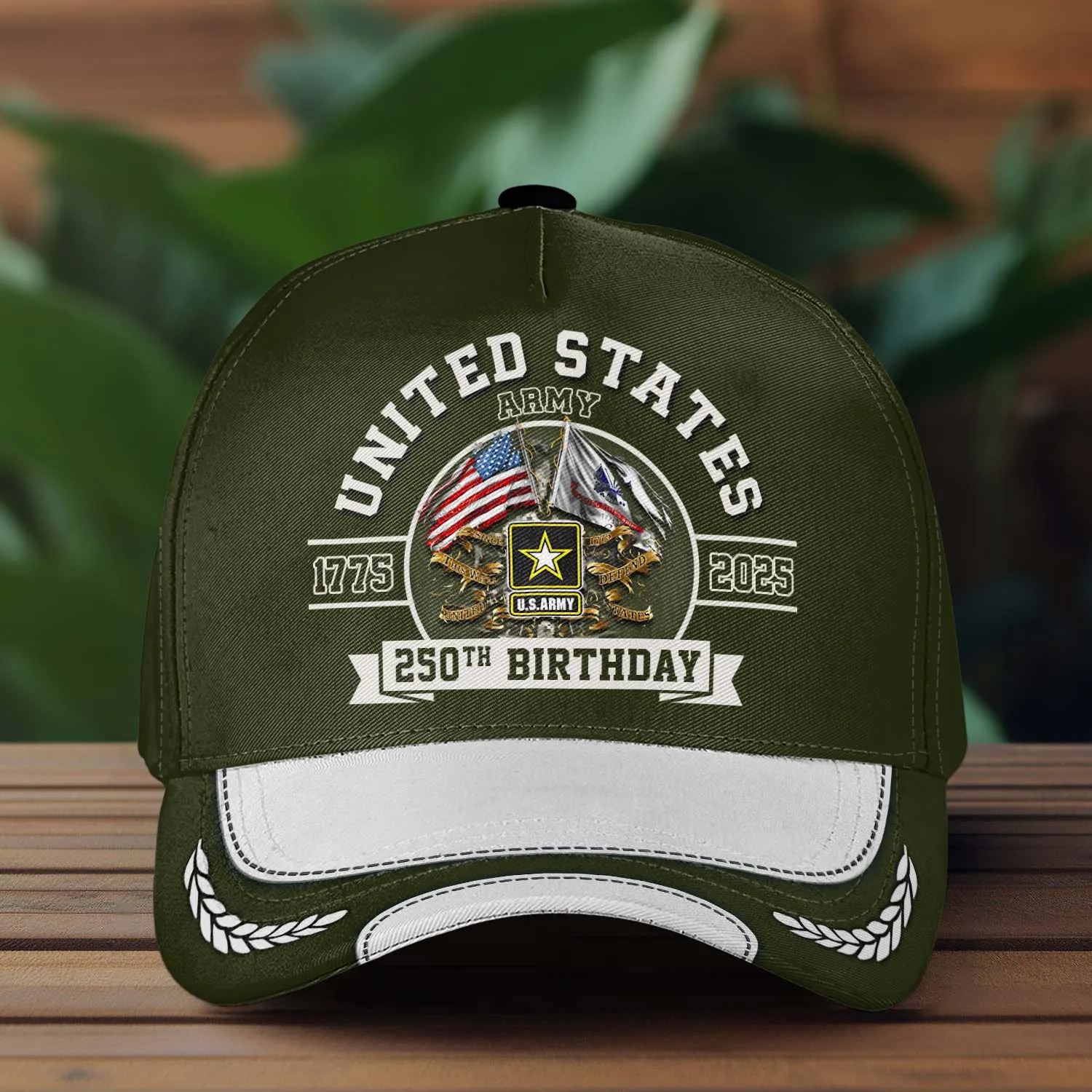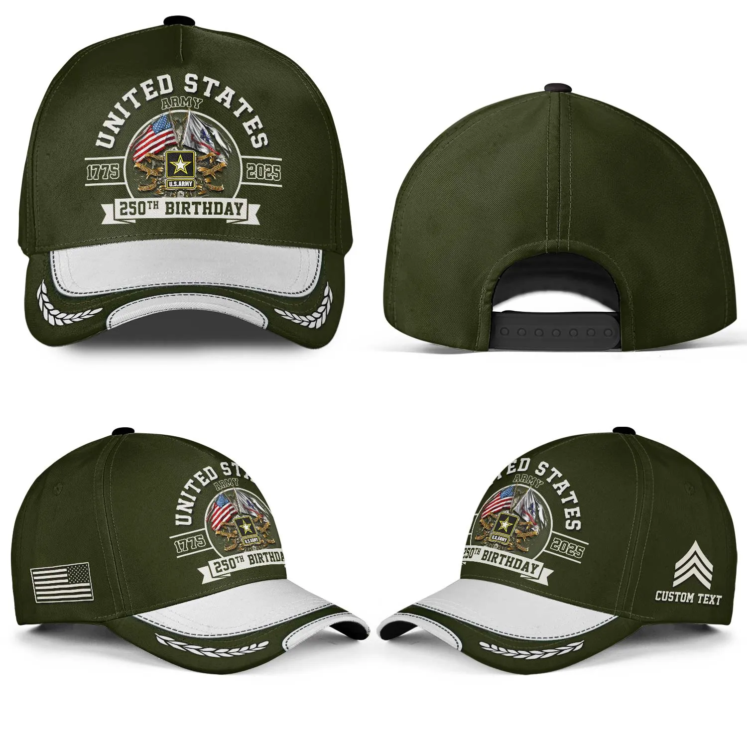 Celebrate 250 years of ultimate land power. The Custom US Army 250th Birthday Hat (1775-2025) features a classic OD Green crown, crossed flags, and the Army Star. Personalize the side panel with your hard-earned Rank and Name. Order your commemorative cover today!